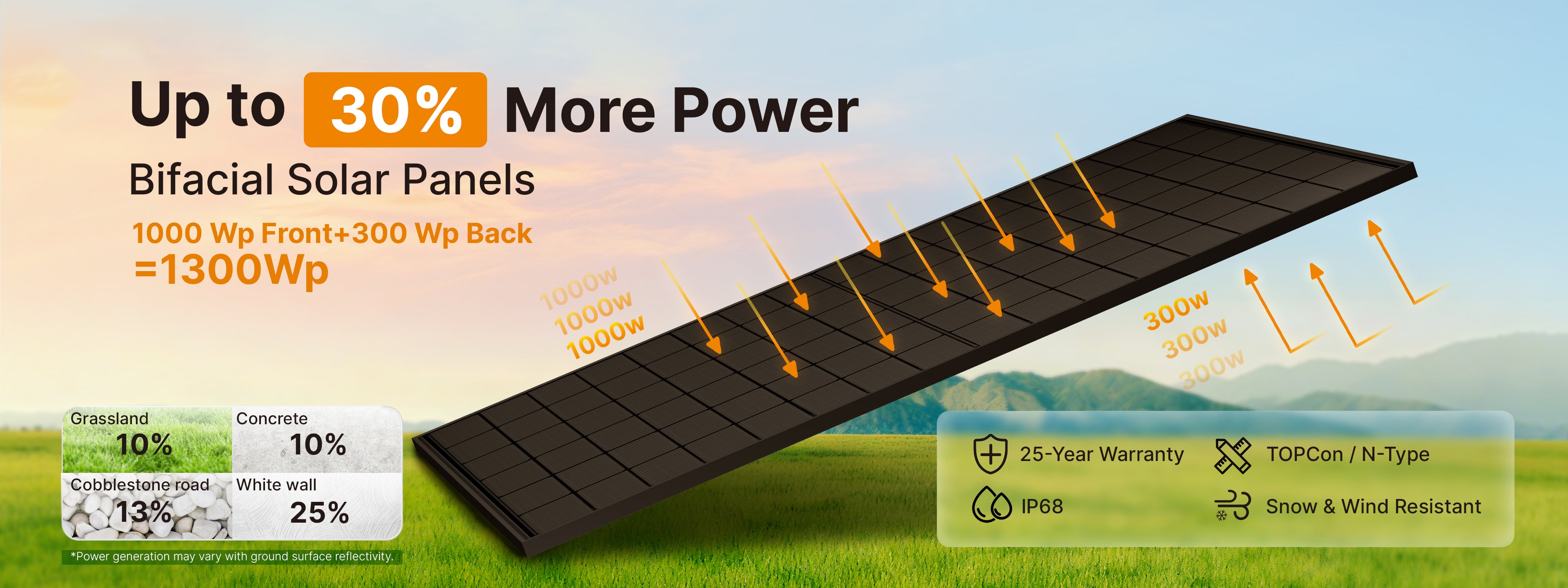 Framed in sleek black with ultra-thin busbars for seamless visual integration, our bifacial N-type solar cells are naturally LID-free, ensuring stable power output. They deliver higher efficiency even in low-light conditions, such as cloudy or foggy days, while the bifacial design captures additional sunlight for greater overall power generation.