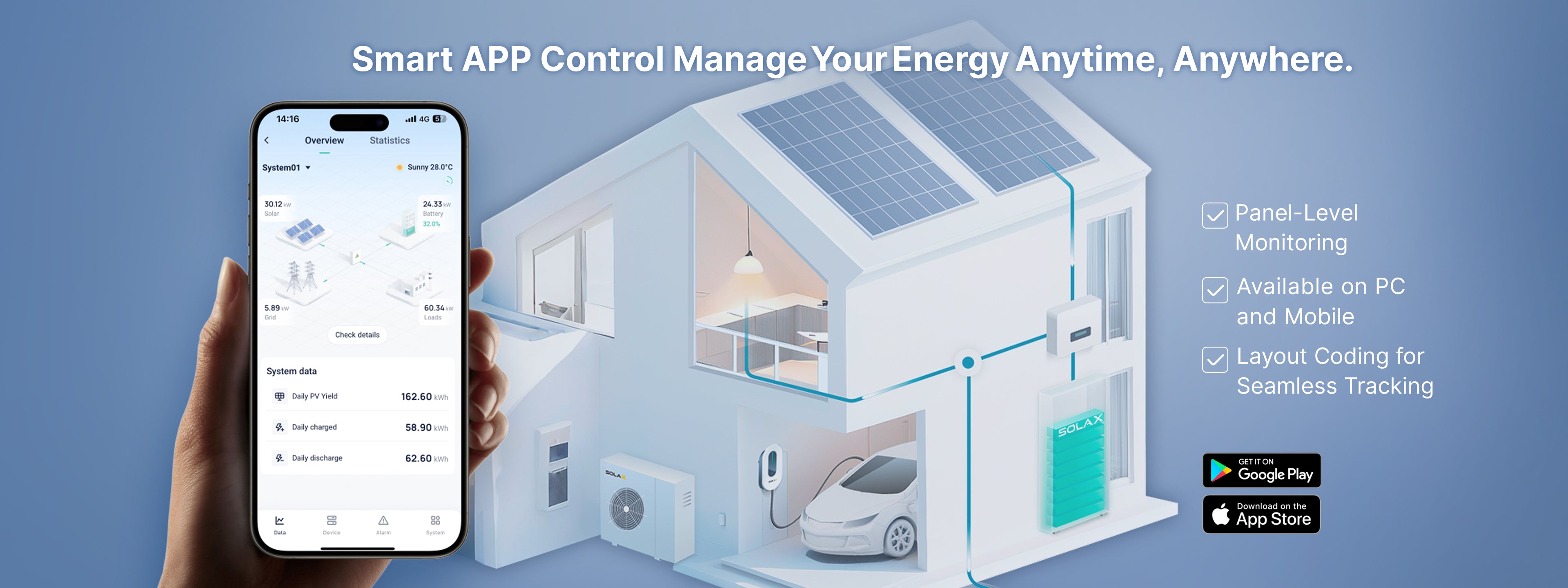 With SolaX Cloud, you can monitor each solar panel 24/7 and see your energy production in real time. Available on Apple Store and Google Play, it works seamlessly on both mobile and desktop, letting you track your power anytime, anywhere—simple, clear, and worry-free.